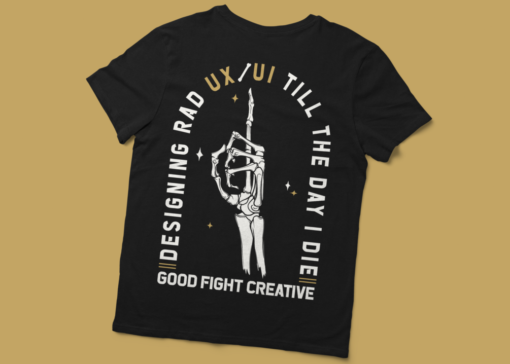 - Bold back design with "Designing Rad UX/UI Till the Day I Die" saying